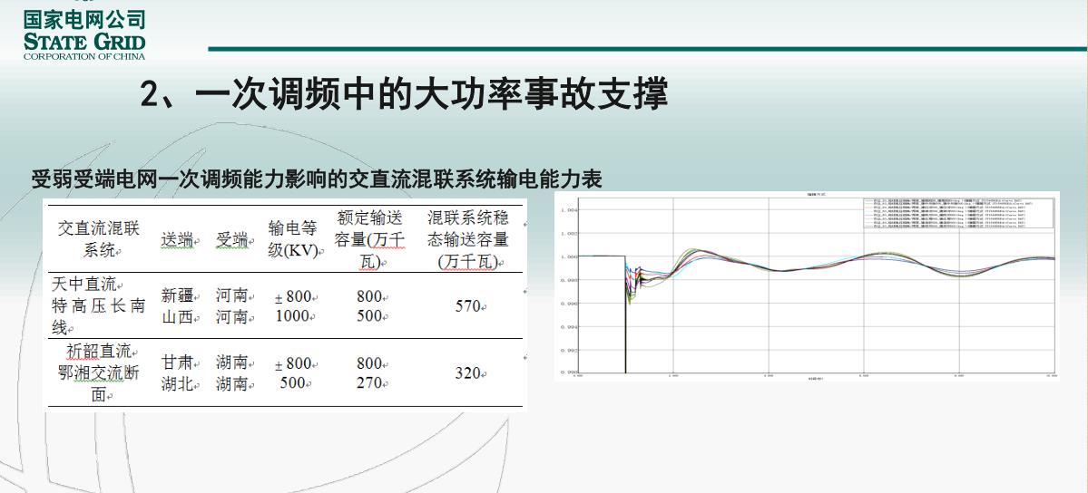 儲能在一次調(diào)頻中的大功率事故支撐:這是基于國標的需求做的測算。這是受弱受端電網(wǎng)一次調(diào)頻能力影響的交直流混聯(lián)系統(tǒng)輸電能力表。這個對電池有一個非常嚴苛的要求,投入這個場景的應用儲能系統(tǒng),必須有高可靠性和安全性,需要達到99.99%。