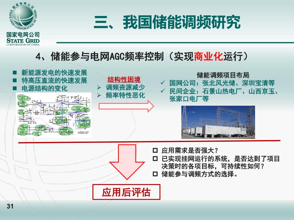 以石景山熱電廠儲能調(diào)頻項目開始,就相繼在山西、河北、浙江等省開展了此項商業(yè)運行項目,開展得如火如荼。因此,國網(wǎng)公司基于開展的這些項目,也布局了針對儲能參與電網(wǎng)調(diào)頻的應用和評估的工作。用于評估儲能調(diào)頻這個應用需求是否強大,評估已經(jīng)掛網(wǎng)運行的系統(tǒng)是否達到了項目決策時的各項目標,它的可持續(xù)性如何,對儲能參與調(diào)頻方式的選擇,最后提出建議。比如大家在儲能調(diào)頻的政策方面或者技術(shù)方面有什么想法和需求,也可以跟我們聯(lián)系,通過我們,由我們再通過我們的項目,可以向國網(wǎng)公司反映一下。