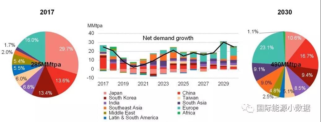 中國儲能網(wǎng)訊:據(jù)彭博新能源財經(jīng)發(fā)布的最新報告,2017年全球液化天然氣(LNG)進口需求2.85億噸(+9.6%),其中日本占29.7%,歐洲占16.0%,中國占13.6%,韓國占13.4%。預(yù)計2018年全球LNG需求增至3.05億噸,此后2019-2022年間每年需求約為3.14-3.30億噸。2023-2030年間,LNG需求每年增長5%,到2030年達到4.9億噸。