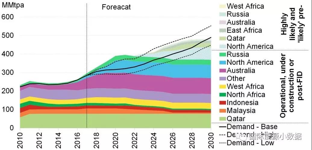 在LNG需求持續(xù)增長的情況下,有沒有足夠的LNG供應(yīng)呢?BNEF分析認為,2018-2020年期間將有3000-3300萬噸的年生產(chǎn)能力投產(chǎn),2021年全球的LNG供應(yīng)能力到2021年達到3.96億噸的高點,足以滿足到2025年以前的國際需求。2025年以后供應(yīng)趨緊,需要新的投資擴大LNG生產(chǎn)能力。