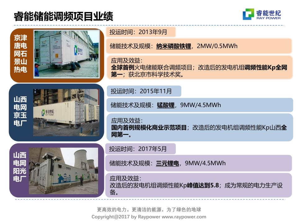 睿能2011年成立提出這個業(yè)務的構想,在2013年有第一個項目落地,這也是全國第一個儲能火電聯(lián)合調頻的項目。這個項目在北京石景山熱電,用2MW/0.5MWh的儲能,配一個22萬的機組。當時我們用的系統(tǒng)是美國A123公司納米磷酸鐵鋰電池。這個項目是比較成功的示范項目,當時我們做出來之后,這臺機組加了儲能之后,調頻性能能夠做到京津唐電網(wǎng)第一名。
