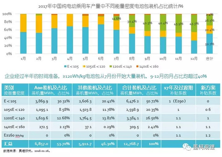 從上面的圖表可以看到,2017年電池包能量密度在105Wh/kg以下的車輛的鋰電裝機占比高達50.7%,超過了一半,如果新政在2017年實施的話,這部分裝機量對應的車輛是無法獲得一分錢補貼的;而能夠獲得基礎系數(shù)1以上的占比也只有28.92%。鮮明體現(xiàn)了新政在能量密度方面的大躍進。雖然從月份進展來看,去年后4個月的裝機表現(xiàn)使得新政的推出也有它的合理性,但是,后4個月的車輛目前為止并沒有多少上路的實證數(shù)據(jù),安全系數(shù)是否足夠尚未可知,這種情況下就迫不及待進一步大幅提升能量密度要求,可能欠妥。
