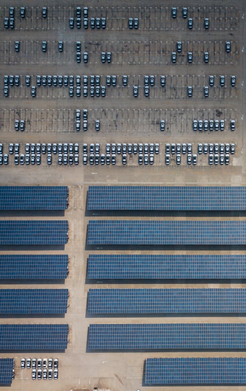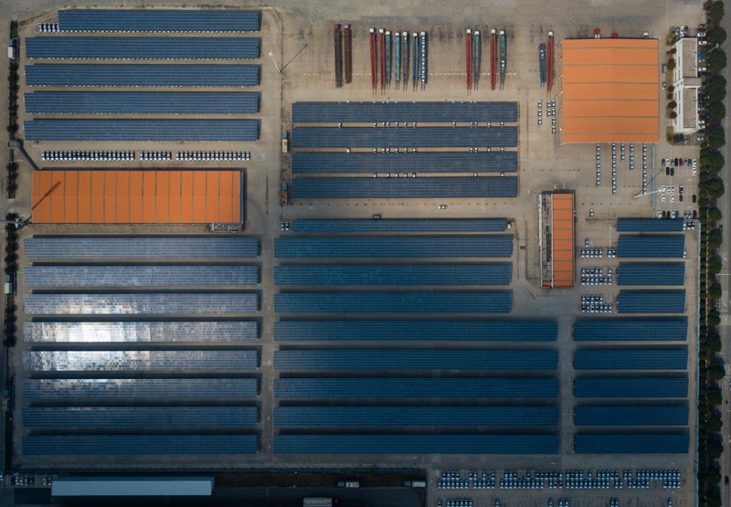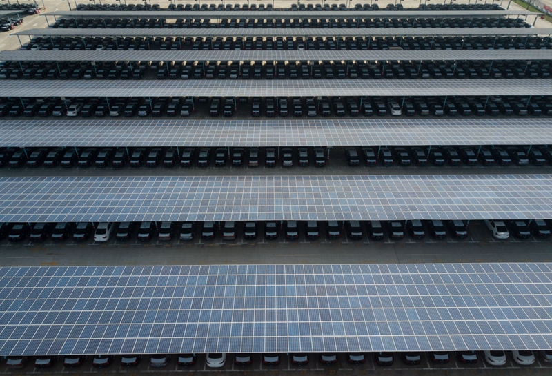 圖為3月26日拍攝的上海大眾汽車南京分公司廠內的光伏車棚(無人機航拍)。