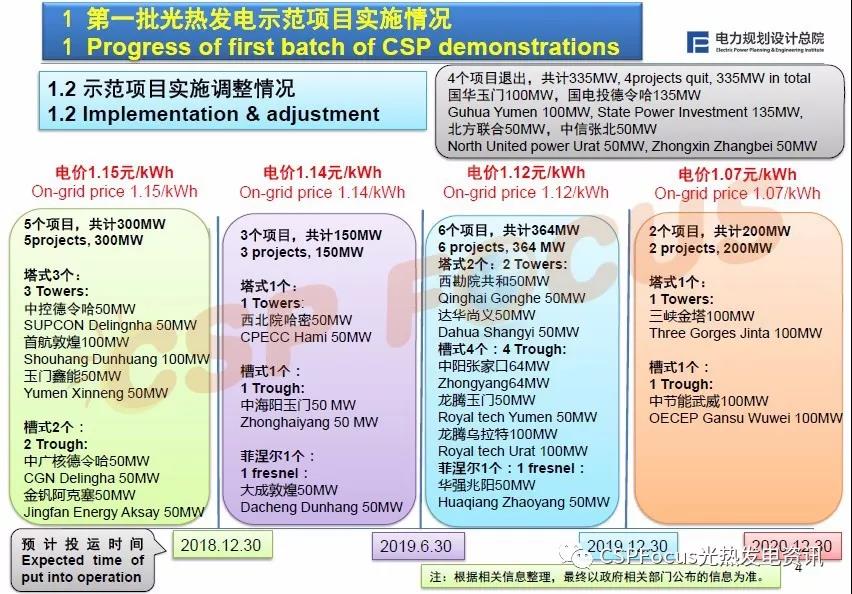 還有4個(gè)項(xiàng)目退出示范項(xiàng)目,有2個(gè)塔式、2個(gè)菲涅爾項(xiàng)目,分別是國華玉門、國電投德令哈、北方聯(lián)合和中信張北,這是目前實(shí)施的整體的情況。