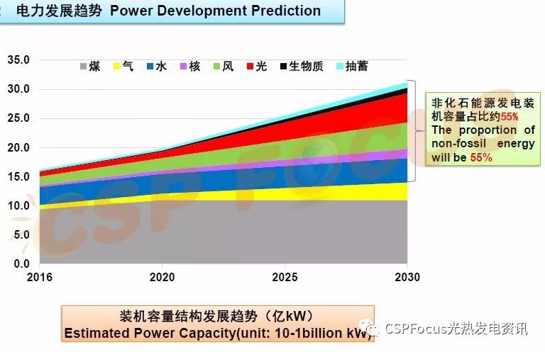 如果非化石能源發(fā)電量占比達(dá)到50%,它的裝機(jī)容量要高出5個(gè)百分點(diǎn)以上。預(yù)測(cè)2030年總裝機(jī)規(guī)模達(dá)到30億千瓦,其中55%是非化石能源發(fā)電裝機(jī)。其中太陽能發(fā)電可能要達(dá)到5億千瓦,去年年底達(dá)到1.3億千瓦,還有接近4億千瓦的裝機(jī)容量。其中,光熱發(fā)電要占相當(dāng)大的比重。因?yàn)樵跊]有儲(chǔ)能的情況下,光伏發(fā)電的棄光問題難以得到很好的解決,而光熱發(fā)電具有穩(wěn)定的功率輸出和可調(diào)節(jié)特性,這就決定了它在我國未來非化石能源發(fā)電里占有重要位置。
