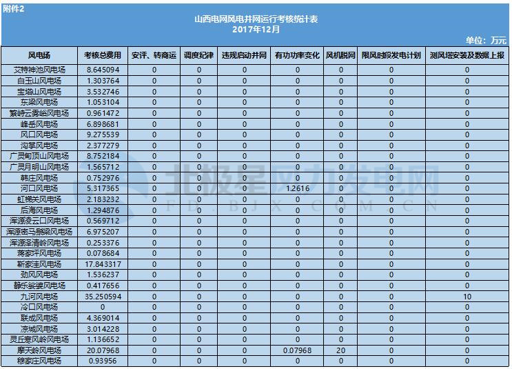 中國儲(chǔ)能網(wǎng)訊:據(jù)悉,山西能監(jiān)辦日前發(fā)布2017年12月份風(fēng)電考核結(jié)果公示。共包括78家風(fēng)電場(chǎng),總裝機(jī)8351.8兆瓦,凈收入全部呈虧損狀態(tài),共計(jì)1506.922435萬元;風(fēng)電上網(wǎng)電量2436248.23兆瓦時(shí),上網(wǎng)電費(fèi)80883.44124萬元。以下為具體數(shù)據(jù):
