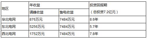 同樣以橋?yàn)匙冸娬?20MW/240MWh獨(dú)立儲能電站為例,假設(shè)一天參與兩次調(diào)峰,且儲存的電量在用電高峰時(shí)段按照風(fēng)電上網(wǎng)電價(jià)賣出(按0.5元/kWh計(jì)算),充放電效率90%,一年按365天計(jì)算,則不同地區(qū)的收益情況如下表: