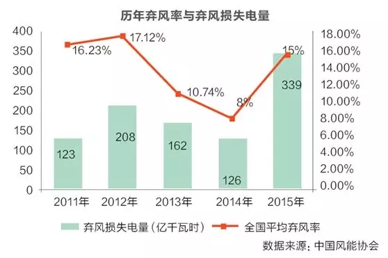 2015年我國棄風(fēng)量達(dá)339億千瓦時再創(chuàng)新高,平均棄風(fēng)率達(dá)到15%,“三北”地區(qū)棄風(fēng)電量占全國總棄風(fēng)電量的99.9%。國家大力打造“風(fēng)電三峽”主力軍的甘肅,棄風(fēng)率接近40%,居全國首位。因“遭受區(qū)域性整體限電”,多家風(fēng)電企業(yè)陷入凈虧損。據(jù)統(tǒng)計(jì),當(dāng)年棄風(fēng)電量對風(fēng)能企業(yè)造成的直接經(jīng)濟(jì)損失達(dá)183億元。金風(fēng)科技位于新疆某處風(fēng)電場的棄風(fēng)率達(dá)到40%以上,僅一家電場的損失就接近5億元。