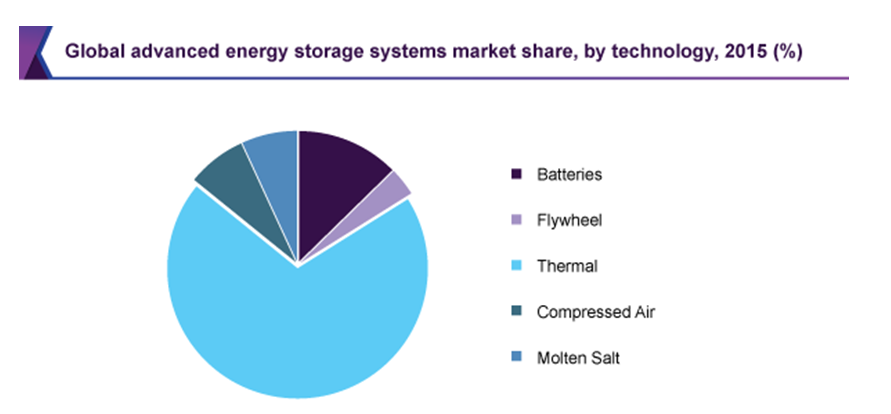 全球儲(chǔ)能系統(tǒng)市場(chǎng)可以按技術(shù)和地區(qū)分類。在技術(shù)方面,其進(jìn)一步細(xì)分為飛輪、壓縮空氣、熱儲(chǔ)能、蓄電池、熔鹽等儲(chǔ)能市場(chǎng)。熱儲(chǔ)能技術(shù)在2014年引領(lǐng)全球市場(chǎng)的發(fā)展,占產(chǎn)能總量份額的70.8%。由于高可靠性、高效率和更長(zhǎng)的使用壽命,飛輪技術(shù)具有巨大的發(fā)展?jié)摿?。另一方面,蓄電池預(yù)計(jì)將成為增長(zhǎng)最快的技術(shù)領(lǐng)域。預(yù)計(jì)到2022年,復(fù)合年增長(zhǎng)率將達(dá)到近18%。