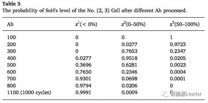 下圖為電池組的仿真結(jié)果,圖b為電池組內(nèi)的溫度分布,圖c為電池組內(nèi)散熱媒介的流動速度分布。根據(jù)電池組內(nèi)的溫度分布,就可以根據(jù)式(11)計算出的到不同單體電池的容量衰降,并據(jù)此計算單體電池的健康狀態(tài)。我們以電池組中最中間的一只電池(2,3)為例,計算了循環(huán)不同的周期后電池衰降到不同狀態(tài)的概率,如下表5所示??梢钥吹皆诮?jīng)過1000次循環(huán)后該電池失效的幾率達到0.9991。整個電池組在不同的循環(huán)時間后失效的概率如下表6所示,可以看到在經(jīng)過500Ah充電后,電池組失效的概率為0.3754,在充電700Ah后電池組的失效概率達到0.999。