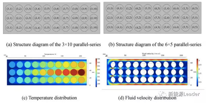 電池組的備份形式主要分為熱備份、冷備份和熱待機三種形式,這里我們探討一下電池組熱備份的情況下電池組的可靠性分析。熱備份也可以分為兩種類型:“并聯(lián)”或者“串聯(lián)”。下圖a和b分別展示了“串聯(lián)”備份(3并10串)和“并聯(lián)”備份(6并5串)兩種模式的電池結(jié)構(gòu),并通過調(diào)節(jié)電池組的工作電流保證兩種備份模式下電池組中的單體電池的工作電流相同。因此兩種備份模式下,電池組的溫度分布和散熱媒介的速度分布也是相同的,如下圖的c和d所示。那么這兩種備份模式對于鋰離子電池組的可靠性會產(chǎn)生什么影響嗎?