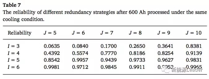 下圖展示了上述的兩種備份模式下,鋰離子電池的可靠性隨著時間變化的曲線,從圖中我們可以看到在經(jīng)過600Ah充電后,沒有備份的3并5串電池的可靠性下降到了0.0635,而有備份的電池組可靠性明顯上升,3并10串電池組的可靠性為0.8381,6并5串電池組的可靠性高達0.9981,其他的備份方式的電池組可靠性如下表所示。從計算結(jié)果來看,不同的備份模式會對電池組的可靠性產(chǎn)生顯著的影響,在備份電池數(shù)量相同的情況下,并聯(lián)備份能夠顯著的提高電池組的可靠性。但是我們也需要注意簡單的增加備份電池的數(shù)量并不能提高電池組的可靠性,例如同樣在6并的情況下,隨著串聯(lián)電池數(shù)量的增加,會出現(xiàn)可靠性降低的情況,這主要是因為隨著串聯(lián)電池數(shù)量的增加,會導致溫度分布的變化,進而降低電池組的可靠性。
