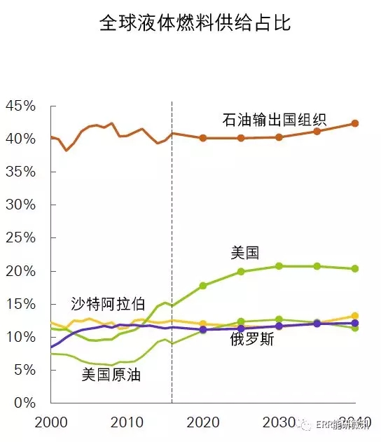 一開始美國的致密油主導(dǎo)了液體燃料生產(chǎn)的增長,隨后則因?yàn)闅W佩克成員國采取增加市場份額的策略而導(dǎo)致其主導(dǎo)了液體燃料生產(chǎn)的增長。