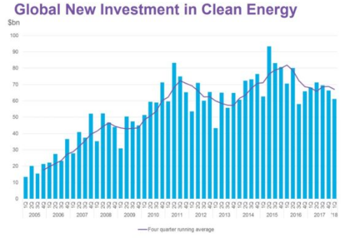 中國儲能網(wǎng)訊:根據(jù)彭博新能源財經(jīng)BNEF的新數(shù)據(jù)顯示,2018年第一季度清潔能源投資同比下降10%至611億美元,新興市場如印度尼西亞、墨西哥、摩洛哥、越南表現(xiàn)搶眼。