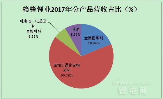 分產(chǎn)品實現(xiàn)營收來看,贛鋒鋰業(yè)2017年在深加工鋰化合物系列方面實現(xiàn)營收占比較大,達66.28%,金屬鋰系列,鋰電池、電芯及其直接材料及其他產(chǎn)品實現(xiàn)營收則為43.72%。