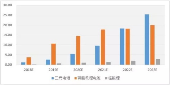 各類動(dòng)力電池逐年退役量預(yù)測(cè)(單位:Gwh)