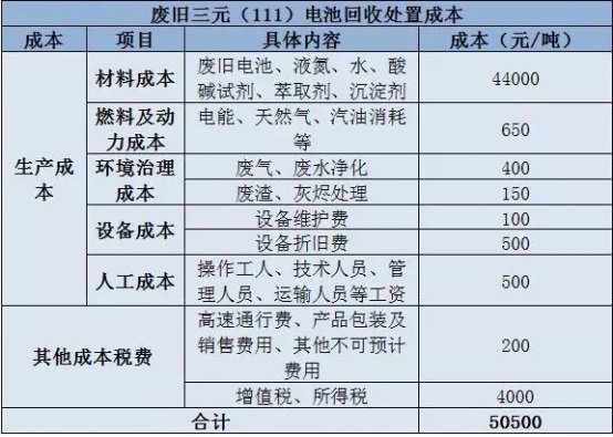 除了產(chǎn)業(yè)趨勢(shì)判定外,中國(guó)電池聯(lián)盟根據(jù)現(xiàn)有回收的技術(shù)和市場(chǎng)情況,對(duì)動(dòng)力電池回收處置收益率進(jìn)行了測(cè)算。從表格中可以看出,在成本構(gòu)成方面,材料成本占主導(dǎo)地位,約占總成本的87%,其中材料成本以回收廢舊動(dòng)力電池的成本最高。現(xiàn)階段,廢舊的三元電池(111型)回收價(jià)格約為4萬(wàn)元/噸,磷酸鐵鋰電池的回收價(jià)格約為1.4萬(wàn)元/噸。