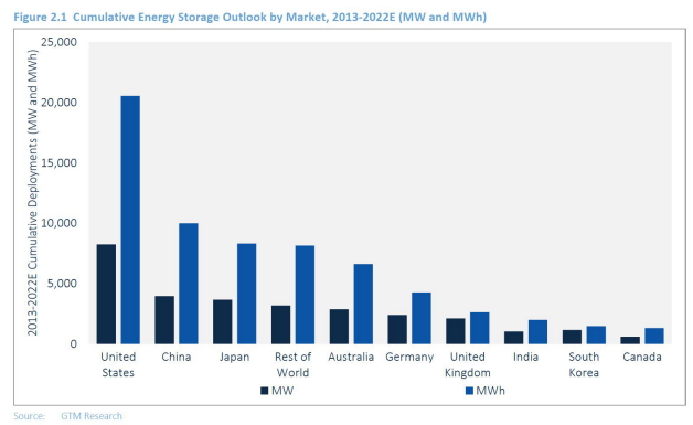 美國(guó)企業(yè)和實(shí)驗(yàn)室在開發(fā)電網(wǎng)儲(chǔ)能方面發(fā)揮了先導(dǎo)作用,因此,其早期的部署超過(guò)其他國(guó)家是理所當(dāng)然的。GTM研究公司儲(chǔ)能研究主管Ravi Manghani說(shuō),大量部署電池儲(chǔ)能系統(tǒng)的關(guān)鍵是其創(chuàng)新的市場(chǎng)設(shè)計(jì)。
