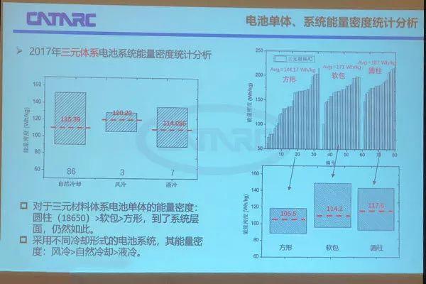 王芳提到,冷卻方式方面,中汽中心共比較了96款車型的冷卻方式,根據(jù)所對(duì)比出的數(shù)據(jù)得出的結(jié)論不是很準(zhǔn)確。因?yàn)樵谒袡z測(cè)的96款車型中只有3款使用了風(fēng)冷,7款使用了液冷。通過(guò)數(shù)據(jù)對(duì)比發(fā)現(xiàn),使用風(fēng)冷的動(dòng)力電池能量密度最高,其次是自然冷,液冷最低,她解釋道:這其實(shí)因?yàn)轱L(fēng)冷數(shù)據(jù)過(guò)少,若是相同的電池系統(tǒng),應(yīng)該是自然冷卻最高,然后是風(fēng)冷,其次是液冷,因?yàn)轱L(fēng)冷和液冷相比自然冷卻,需要的額外零部件增加了電池系統(tǒng)重量,并且在使用中需要額外消耗電力。