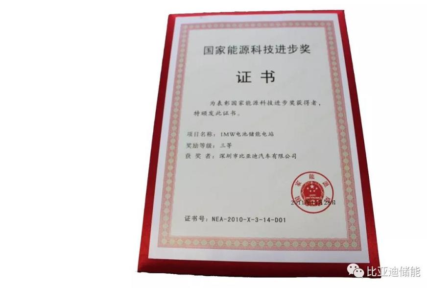 ?比亞迪1MW儲(chǔ)能電站在國(guó)家能源科技進(jìn)步獎(jiǎng)申報(bào)中榮獲三等獎(jiǎng)。