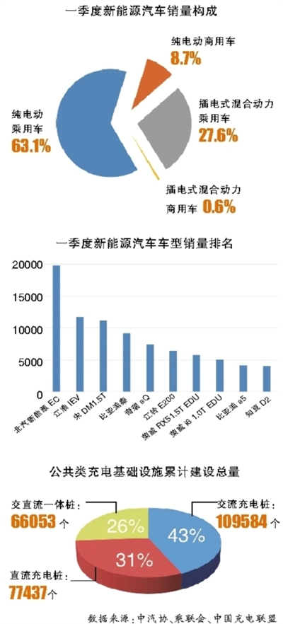 在一季度新能源汽車的銷量構(gòu)成中,純電動(dòng)汽車的銷量占比高達(dá)72%。數(shù)據(jù)顯示,1-3月純電動(dòng)汽車?yán)塾?jì)產(chǎn)銷量分別為10.8萬(wàn)輛和10.2萬(wàn)輛,同比分別增長(zhǎng)124.7%和131%;插電式混合動(dòng)力汽車產(chǎn)銷分別完成4.2萬(wàn)輛和4萬(wàn)輛,同比分別增長(zhǎng)305.3%和242.6%。