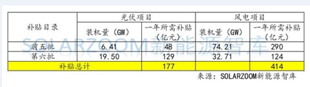 進(jìn)入前六批可再生能源補(bǔ)貼目錄的電站項目中,風(fēng)力發(fā)電項目和光伏發(fā)電項目裝機(jī)量占比超過95%,因此SOLARZOOM智庫在可再生能源補(bǔ)貼測算中不涵蓋生物質(zhì)能和地?zé)崮艿妊a(bǔ)貼測算。經(jīng)測算,目前涵蓋在以發(fā)放的前六批可再生能源補(bǔ)貼目錄中,光伏項目每年所需要的補(bǔ)貼為177億元,風(fēng)電每年所需要的補(bǔ)貼為414億元。