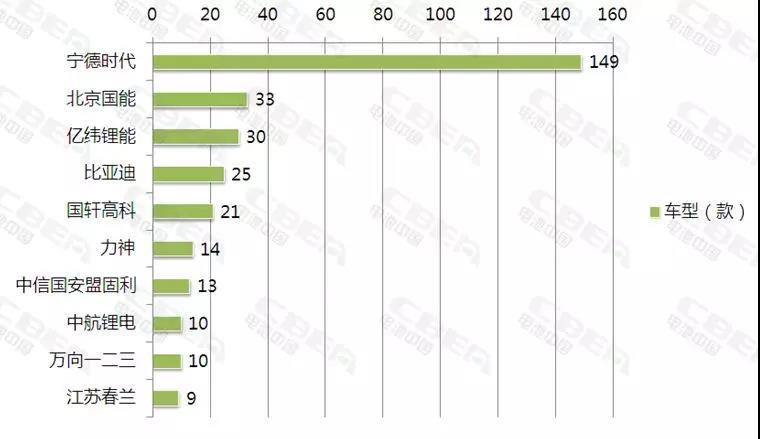 裝機量代表動力電池企業(yè)在當(dāng)前市場的占有量,若要看未來動力電池企業(yè)發(fā)展如何?就要看動力電池企業(yè)配套車型獲批情況,未來哪家動力電池企業(yè)配套車型越多,未來將有機會獲得更多的市場占有量。下面來看2018年新能源汽車推薦目錄1-3批車型配套電池企業(yè)前10名。寧德時代以149款配套車型遙遙領(lǐng)先;位居第2位的是國能,配套車型量為33款;億緯鋰能緊隨其后,配套車型量為30款;從第4名開始,配套車型均低于30款并逐漸下滑,趨勢平緩。