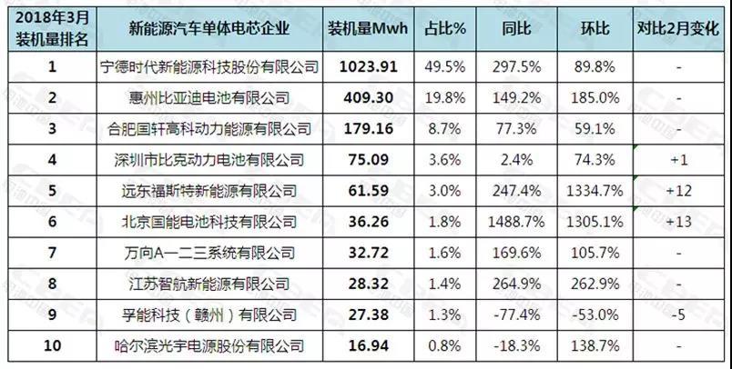圖1:2018年3月國內(nèi)動力電池裝機量排位前10企業(yè)情況