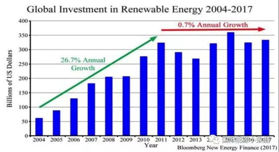 中國儲(chǔ)能網(wǎng)訊:根據(jù)彭博新能源財(cái)經(jīng)的數(shù)字,2004年到2011年間全球可再生能源投資年增長率為26.7%。然而,2011年到2017年間全球可再生能源投資增長率僅為0.7%。2017年日本可再生能源投資下降16%、印度下降20%、德國下降26%、英國下降56%。美國小幅增長1%,而中國大增30%(1330億美元)??梢哉f,如果不是因?yàn)橹袊木薮筘暙I(xiàn),全球的可再生能源投資其實(shí)是在下降的。