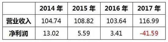 2017年年報顯示,公司2017年營業(yè)收入116.99億元,虧損41.59億元,較上年同期下降-1,318.77%。讓人納悶的是,2017年是近4年營業(yè)收入最高的一年,怎么還虧損近42億元?2014年營業(yè)收入104億元,凈利潤還達到13億元,2015年、2016年營業(yè)收入均在100億元以上,但凈利潤不到2014年的50%,分別為5.59億元、3.41億元。2017年營業(yè)收入創(chuàng)近4年的新高,凈利潤卻往相反方向創(chuàng)新高,巨額虧損近42億元。