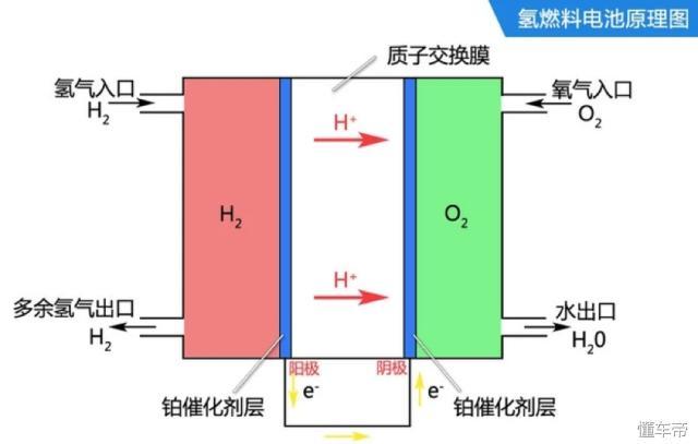 氫燃料電池并不是像內(nèi)燃機(jī)那樣“燃燒”氫氣,而是將氫氣和氧氣分別置于陽(yáng)極和陰極兩端,氫質(zhì)子穿透質(zhì)子交換膜(PEM)的孔洞與氧分子結(jié)合,在催化劑的作用下發(fā)生氧化還原反應(yīng),而被阻隔在膜外的電子需要繞道電極板兩端,在此過(guò)程中不經(jīng)過(guò)熱能轉(zhuǎn)換直接產(chǎn)生了電流,轉(zhuǎn)化效率高,無(wú)噪音,并生成最終唯一的反應(yīng)產(chǎn)物——水。