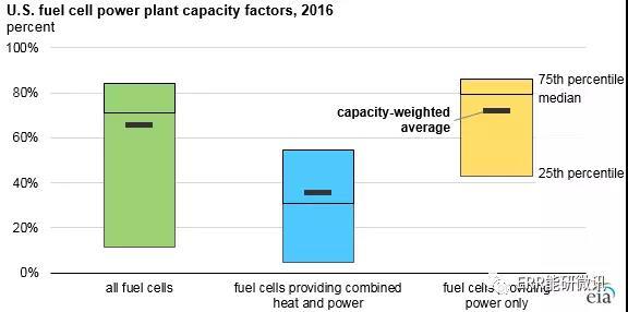 相較電力設(shè)施的燃料電池,熱電聯(lián)產(chǎn)設(shè)施的燃料電池典型低利用率。電力設(shè)施的燃料電池利用率中值為81%,熱電聯(lián)產(chǎn)設(shè)施的燃料電池利用率中值為44%。