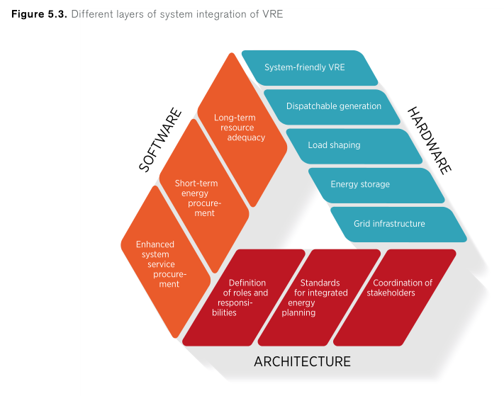 可再生能源對電力系統(tǒng)的影響日益深廣,如下圖可分階段來討論,以幫助識別與可再生能源集成相關(guān)的主要挑戰(zhàn),并選擇適當(dāng)?shù)拇胧﹣碓鰪婌`活性。這種簡單的分類還對可能的挑戰(zhàn)進(jìn)行分類,并為任務(wù)的優(yōu)先級提供了一個有用的框架: