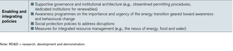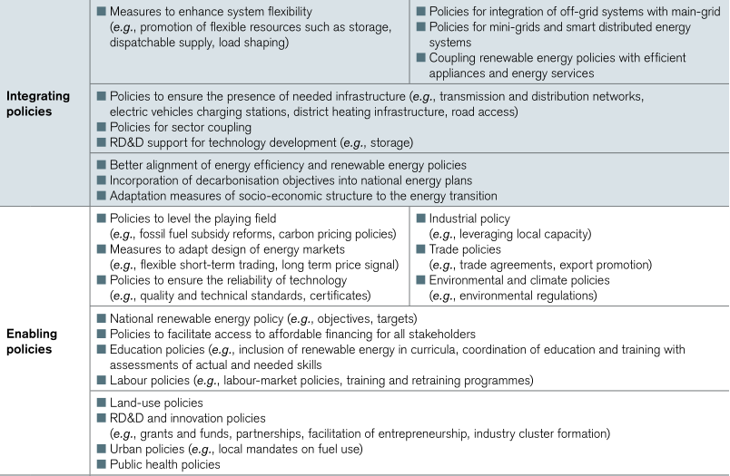 實現(xiàn)能源轉(zhuǎn)型,需要的不僅僅是針對能源部門制定的政策更為全面。能源領(lǐng)域的迅速變化需要一種新的政策分類方式,這涉及到能源系統(tǒng)的轉(zhuǎn)變和它賴以生存的社會經(jīng)濟結(jié)構(gòu)的轉(zhuǎn)變。這期間的政策需要采取綜合辦法,兼顧這兩個方面。隨著可再生能源從利基轉(zhuǎn)向主流,推動轉(zhuǎn)型的政策不僅必須涵蓋可再生能源的部署,還必須納入影響可持續(xù)性和轉(zhuǎn)型速度的更廣泛的能源系統(tǒng)和經(jīng)濟政策。