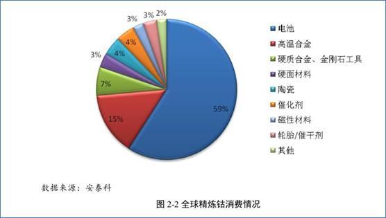 就金屬鈷而言,據安泰科數據顯示,2017年全球鈷消費約為11.5萬金屬噸,同比增長接近11%。其中,電池行業(yè)占比高達59%。