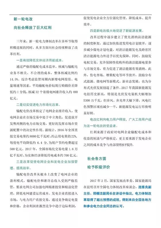 中國儲能網(wǎng)訊:三年來,新一輪電力體制改革堅持新發(fā)展理念,堅持社會主義市場經(jīng)濟方向,按照管住中間、放開兩頭的要求,以大力推動市場化交易為中心,有序放開競爭性業(yè)務和競爭性環(huán)節(jié)電價,加強政府對自然壟斷環(huán)節(jié)的監(jiān)管,優(yōu)化電力資源配置,還原電力商品屬性,拓寬社會投資渠道,改善供電服務質(zhì)量,形成主要由市場決定電價的機制。當前,中國特色社會主義進入新時代,電力體制改革也要有新氣象、新作為。站在新的歷史起點,對改革進展、改革成效和存在問題進行階段性總結,并對下一步推進電力改革提出政策建議,很有必要。
