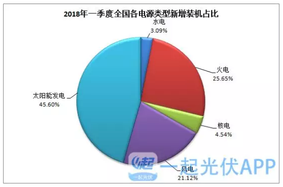 通過上述數(shù)據(jù)可以看出,一季度太陽能新增裝機多達(dá)11.36GW,同比增長188.32%。此外,從各電源類型新增裝機占比上來看,太陽能發(fā)電也高達(dá)45.60%,位居首位并且遠(yuǎn)高于其他電源類型(如下圖所示)。