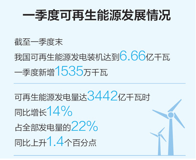 同時(shí),可再生能源利用水平顯著提升。一季度可再生能源發(fā)電量達(dá)3442億千瓦時(shí),同比增長(zhǎng)14%;可再生能源發(fā)電量占全部發(fā)電量的22%,同比上升1.4個(gè)百分點(diǎn)。“三棄”問題有效緩解:全國(guó)基本無棄水;棄風(fēng)電量91億千瓦時(shí),棄風(fēng)率8.5%,同比下降8個(gè)百分點(diǎn);棄光電量16.2億千瓦時(shí),棄光率4.3%,同比下降5.4個(gè)百分點(diǎn)。