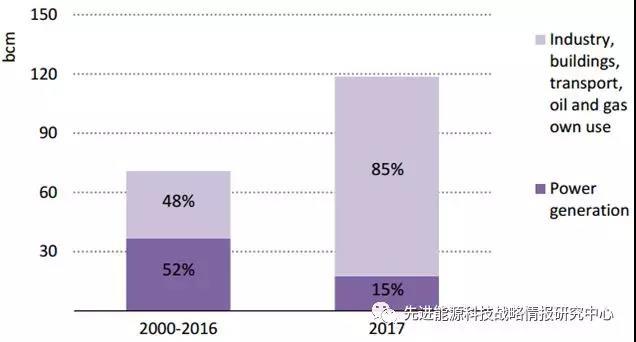 歐盟的天然氣需求也顯著增長了約160億立方米,主要原因是經濟強勁增長驅使行業(yè)需求回升。但歐盟的天然氣消費量仍比2010年的歷史峰值低了10%以上。在美國,2017年燃氣發(fā)電天然氣需求量下降8%,抵消了一大部分世界其他地區(qū)增長需求。美國去年的情況凸顯了發(fā)電燃料相對價格對電力行業(yè)排放強度發(fā)展趨勢的影響:2017年天然氣價格略有上漲,使得燃氣發(fā)電受到可再生能源和煤炭的擠壓。天然氣需求增長的構成正在發(fā)生變化:在過去的十年中,全球一半的天然氣需求增長來自電力部門。而在2017年,超過80%的增長來自工業(yè)和建筑行業(yè),電力部門天然氣需求份額可能逐步下降。