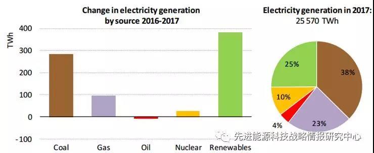 2017年,可再生能源新增發(fā)電量380 TWh,占全球新增發(fā)電量的近一半,使其在全球電力構成中的份額達到25%的歷史新高。2017年可再生能源新增發(fā)電量僅次于煤炭,連續(xù)第三年高于天然氣。2017年,全球煤炭發(fā)電量增長了280 TWh(同比增幅3%),占總增長的三分之一。亞洲是燃煤發(fā)電量增長的主要地區(qū),增加了365 TWh。盡管中國和印度在這一增長中占主導地位,但韓國、日本和印度尼西亞也有顯著貢獻,而美國、歐盟、俄羅斯、巴西和南非電力用煤的減少僅能部分抵消亞洲煤炭消費的增長。燃氣發(fā)電新增95 TWh(同比增幅1.6%),占新增發(fā)電總量約15%;其中美國下降7.6%(-110 TWh),世界其他地區(qū)增長4.6%(+205 TWh),最重要的貢獻來自歐盟、中國和東南亞。