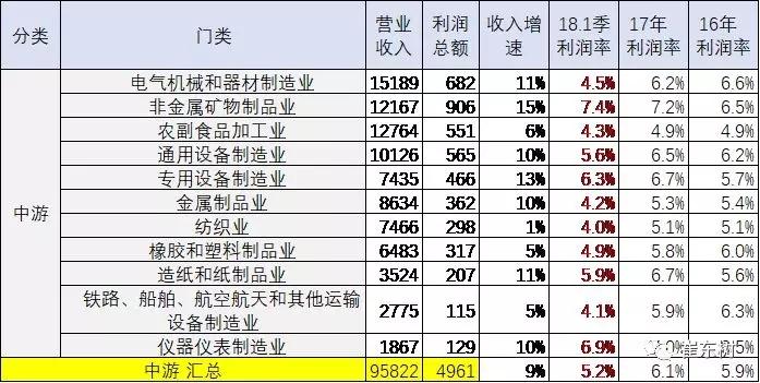 2018年一季度,上游行業(yè)的銷售收入和利潤都是爆發(fā)式增長,尤其是以采礦業(yè)為代表的銷售利潤率爆發(fā)式的增長,煤炭開采行業(yè),18年一季度的利潤率達到12.5%,較16年的3.4%,暴增了近十個百分點。而石油制品行業(yè)的利潤從,16年的-7%的利潤率,到17年百分之5%,到2018年21%,形成了,利潤率爆發(fā)式的反轉。