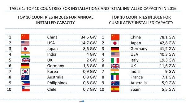 對比2016年全球新增裝機和累計裝機排名前10的國家(如下圖所示)可以看出,2017年,以中國、印度的亞洲市場新增裝機保持快速增長,并成為支撐全球光伏擴張的重要力量,而以美國、德國為代表的歐美地區(qū)國家新增裝機則普遍出現(xiàn)增速放緩甚至負增長。此外,巴西、澳大利亞等新興市場開始嶄露頭角,增長勢頭較為明顯。