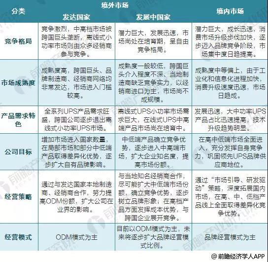 而大部分發(fā)展中國(guó)家的市場(chǎng)成熟度較低,小功率UPS市場(chǎng)需求巨大,在線式UPS中高端產(chǎn)品市場(chǎng)尚處于培育期,跨國(guó)UPS巨頭對(duì)當(dāng)?shù)厥袌?chǎng)介入程度不深,本土制造廠商缺乏競(jìng)爭(zhēng)實(shí)力,因此,市場(chǎng)競(jìng)爭(zhēng)以經(jīng)銷(xiāo)商進(jìn)口產(chǎn)品為主,市場(chǎng)呈自由競(jìng)爭(zhēng)格局。鑒于發(fā)展中國(guó)家市場(chǎng)潛力巨大,發(fā)展迅速,且市場(chǎng)進(jìn)入門(mén)檻不高,公司采取與當(dāng)?shù)刂?jīng)銷(xiāo)商合作的策略,盡可能擴(kuò)大中低端市場(chǎng)份額,確立差異化競(jìng)爭(zhēng)優(yōu)勢(shì),逐步樹(shù)立自有品牌形象,并在中高檔產(chǎn)品方面發(fā)揮比較成本優(yōu)勢(shì),積極與跨國(guó)企業(yè)展開(kāi)競(jìng)爭(zhēng)。