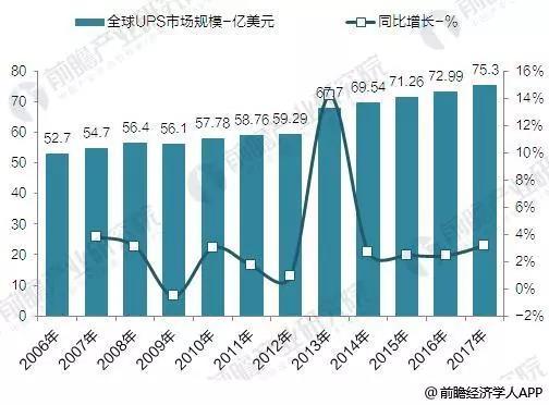 圖1 2006-2017年全球UPS市場(chǎng)規(guī)模走勢(shì)圖(單位:億美元,%)