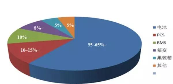 儲能系統(tǒng)的構(gòu)成主要包括電池單元,電池管理系統(tǒng)(BMS)、能量轉(zhuǎn)換系統(tǒng)(PCS),中央控制系統(tǒng)。儲能系統(tǒng)由儲能變流器(PCS)、蓄電池儲能單元、蓄電池管理系統(tǒng)(BMS)和預(yù)裝式集裝箱組成。各單元投資比例如圖1: