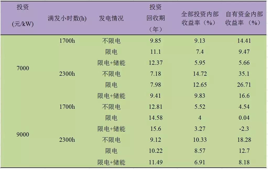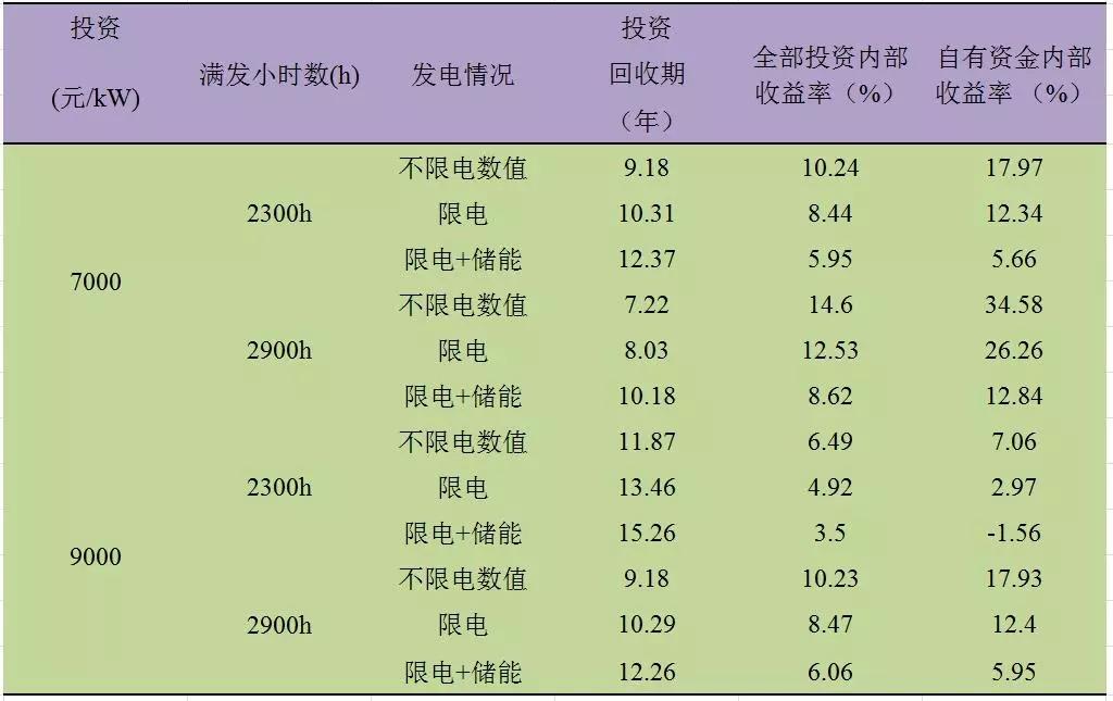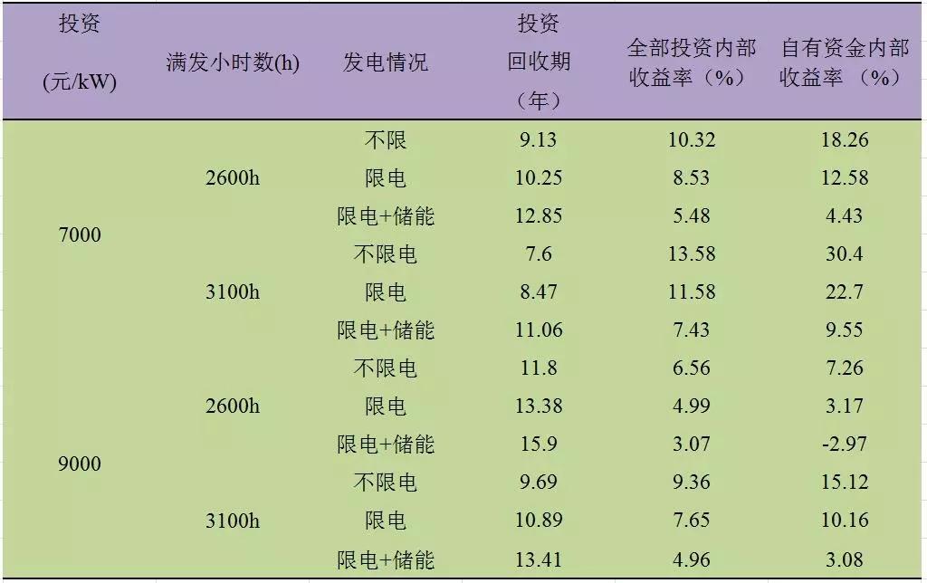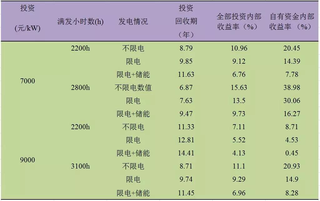 Ⅱ類電價區(qū)的滿發(fā)小時數(shù)在2300h-2900h之間。通過測算,經(jīng)濟性指標匯總結(jié)果匯總?cè)绫?所示:
