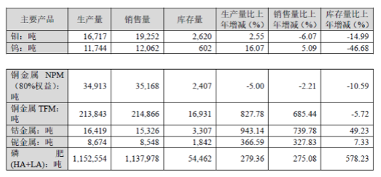洛陽鉬業(yè)2017產(chǎn)銷量情況分析表: