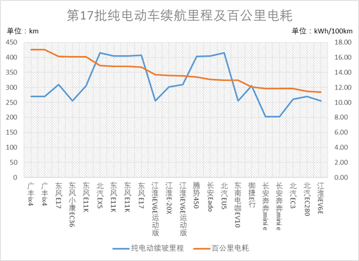 在第17批新能源車型中,百公里電耗最低的車型為江淮iEV6E,達到了11.37kWh/100km,而表現(xiàn)最差的是廣汽豐田的ix4,百公里電耗高達17.04kWh/100km。