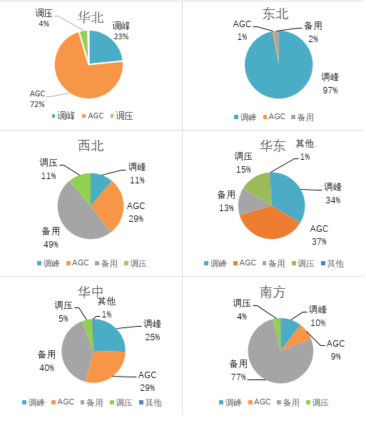 從分項電力輔助服務補償費用來看,調(diào)峰、AGC和備用補償費用占總補償費用的90%以上。其中,西北、東北區(qū)域調(diào)峰補償力度最大,華北、華東區(qū)域調(diào)頻(西北區(qū)域調(diào)頻為AGC加一次調(diào)頻,其他區(qū)域調(diào)頻為AGC)補償力度最大,南方、華中區(qū)域備用補償力度最大??傮w來看,西北區(qū)域整體電力輔助服務補償力度最大(見圖3)。