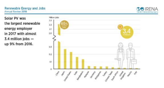 2017年,太陽能光伏行業(yè)仍然是所有可再生能源技術(shù)的最大雇主,約占340萬個就業(yè)崗位。2017年實現(xiàn)創(chuàng)紀錄的94吉瓦部署容量,增加近9%。中國約占2/3的光伏就業(yè)崗位,相當于220萬人,比上一年增長了13%。